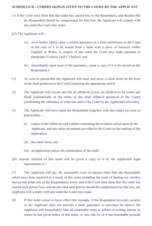 6.申请人将支付被申请人以外的任何人因本命令而发生的合理费用,包括查明该人是否拥有被申请人的任何资产的费用,如果法院后来认为本命令造成了该人的损失,并决定应赔偿该人的损失,申请人将遵守法院可能作出的任何命令。